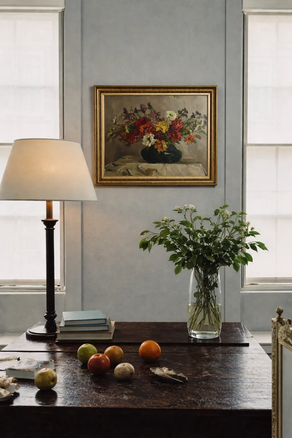 Ce tableau s’inscrit dans la tradition des natures mortes post-impressionnistes allemandes, avec une palette chaleureuse et une composition symétrique rappelant des artistes mineurs influencés par des maîtres comme Max Liebermann, sans innovation formelle